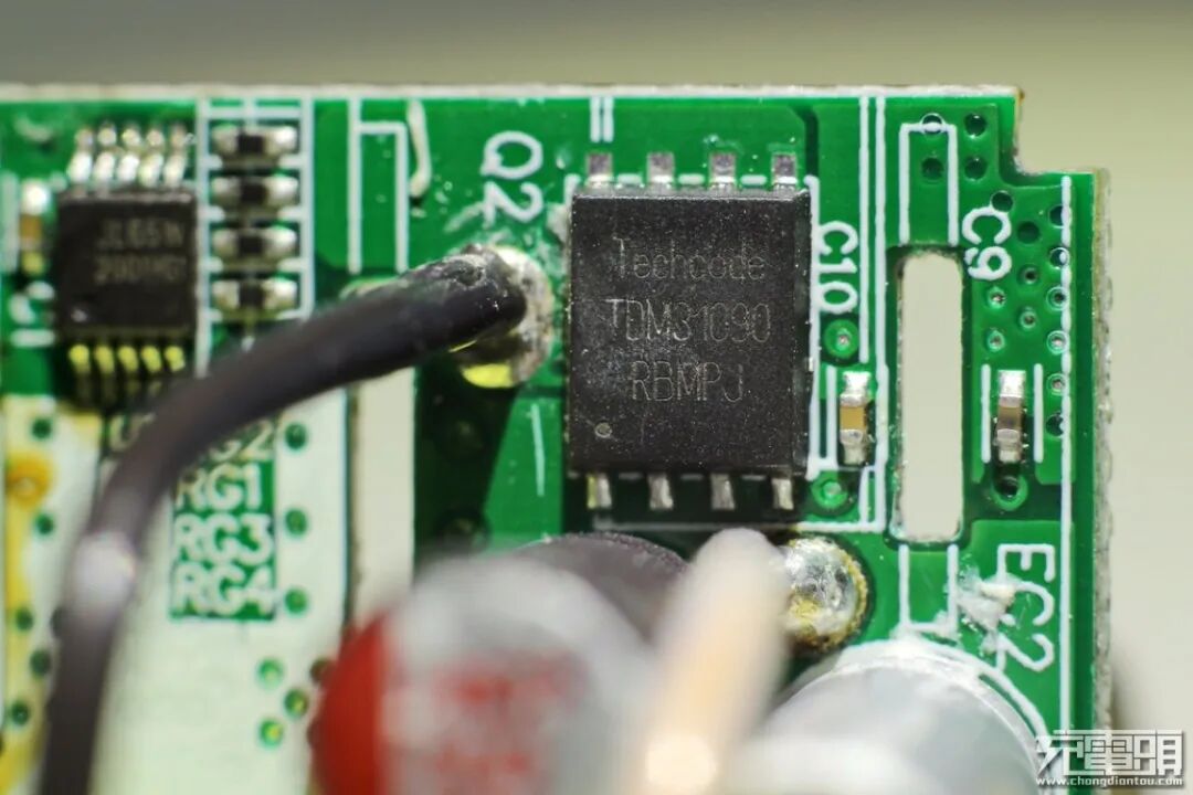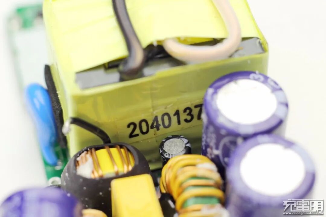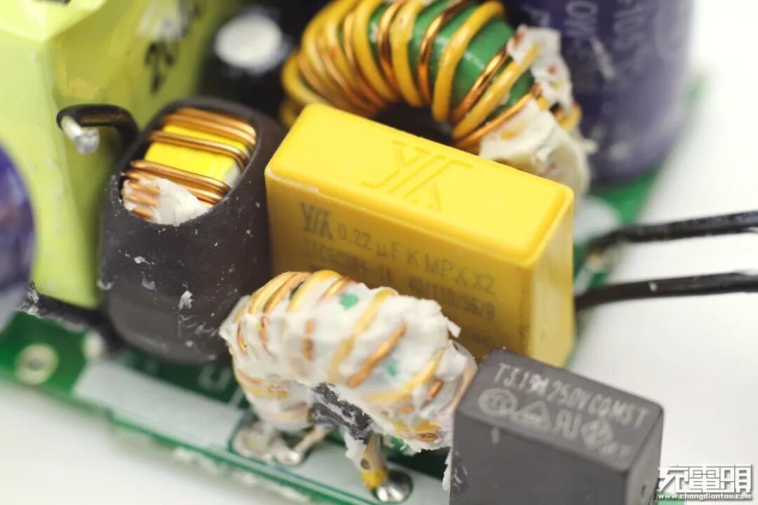 其中两颗高压滤波电解电容采用长焊脚焊接设计,以便充分利用内部空间减小充电器体积。此外焊脚和电容均套有绝缘管。
