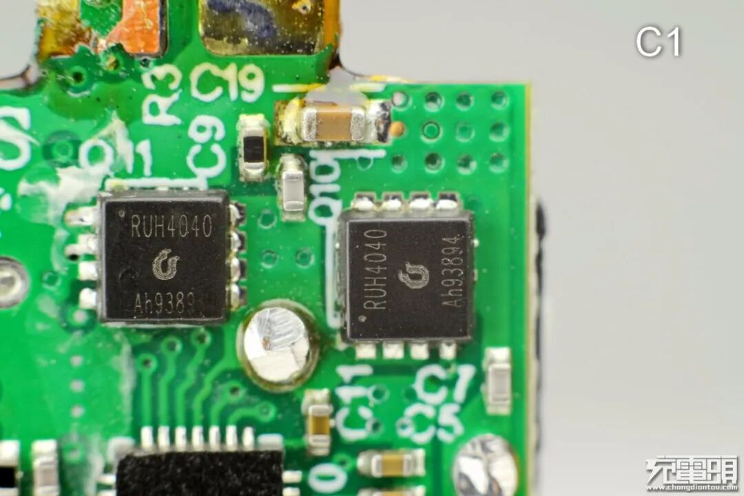 外挂两颗锐骏半导体MOS,型号为RUH4040M2,NMOS,耐压40V,用于为USB-C1口输出同步整流降压。