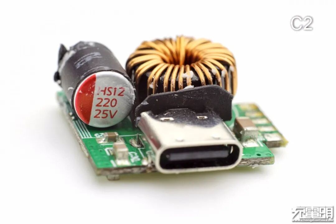 输出滤波固态电容规格为25V 220μF,USB母座和电感之间也有绝缘板进行隔离。