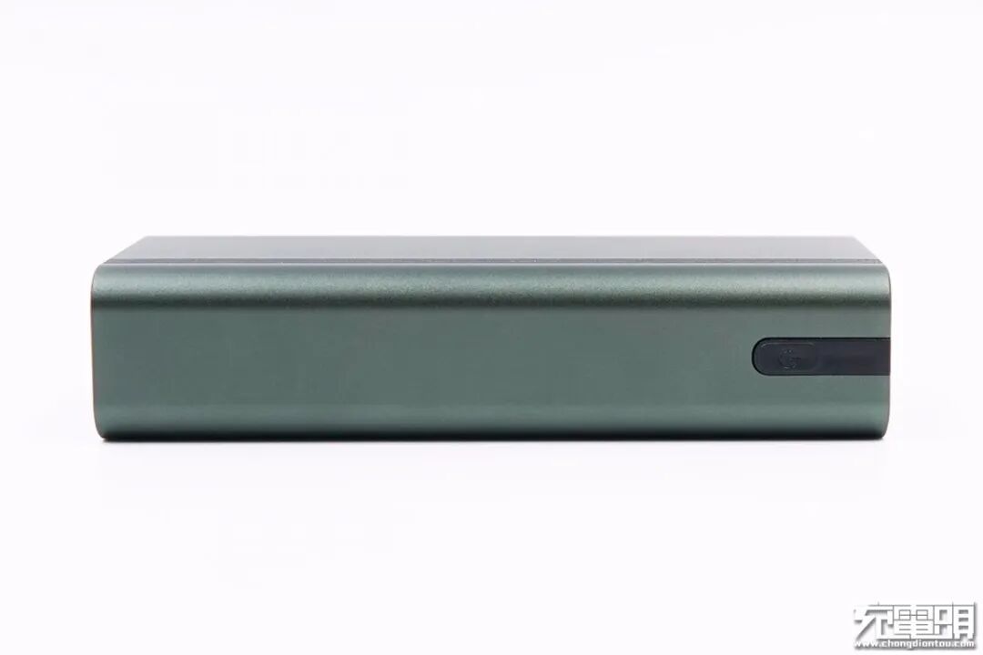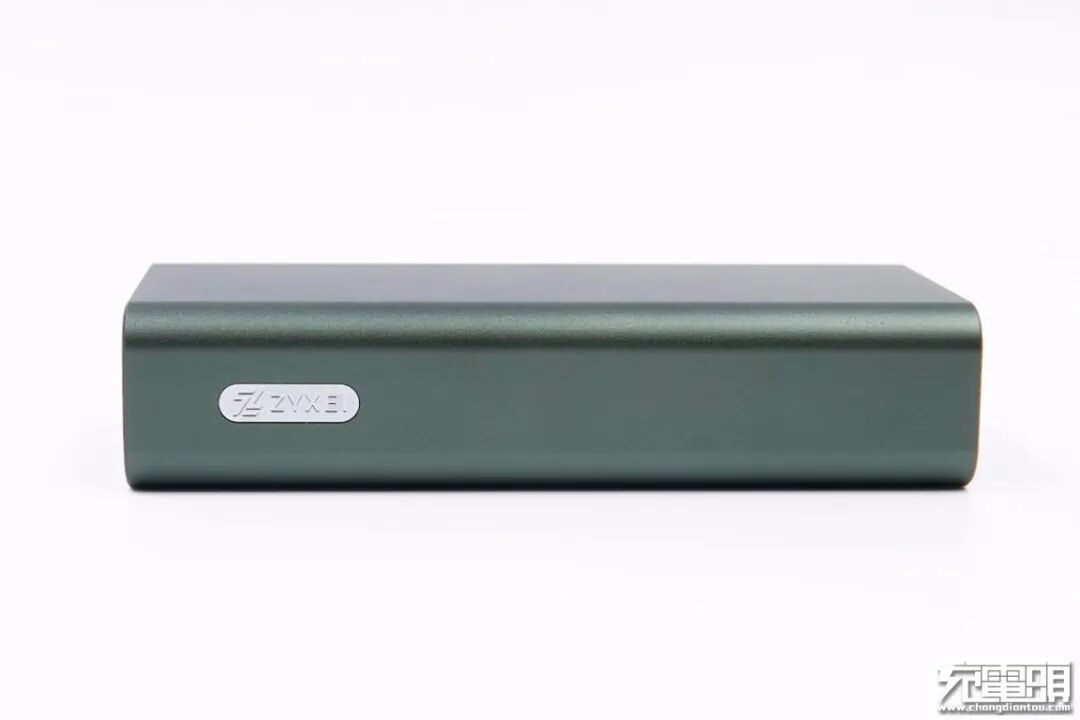 ZYXEI全协议快充移动电源机身采用铝合金金属外壳,表面阳极氧化和喷砂处理,呈墨绿色,两侧弧面过渡,整体触摸光滑手感好,机身正面设计有三条凹槽。