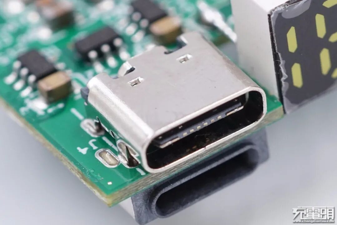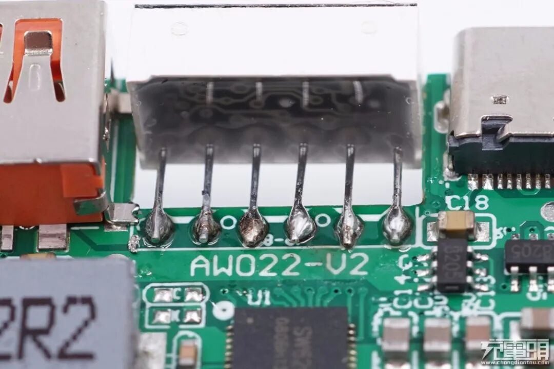 经过对PCB板正背面电路观察分析发现,ZYXEI全协议移动电源采用一颗主控芯片进行升/降压转换实现三口任一口快充输入/输出架构。下面我们就从输入端开始一一了解各元器件。