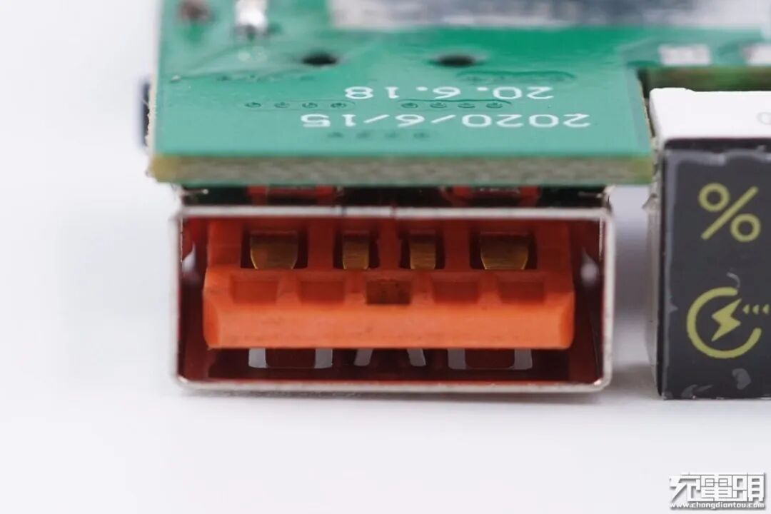 USB-A输出母座特写,橘红色胶芯,正负极加宽。