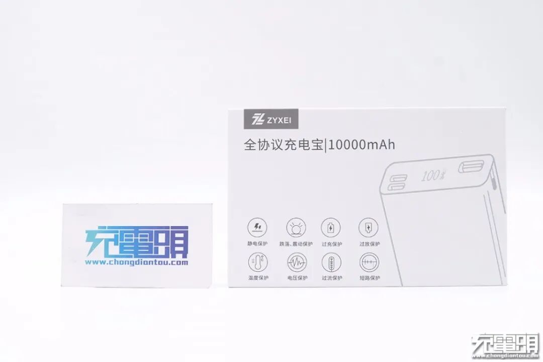 产品采用硬纸质包装盒,顶面印有ZYXEI品牌、全协议充电宝名称、10000mAh、产品简图和八大保护特性标识。