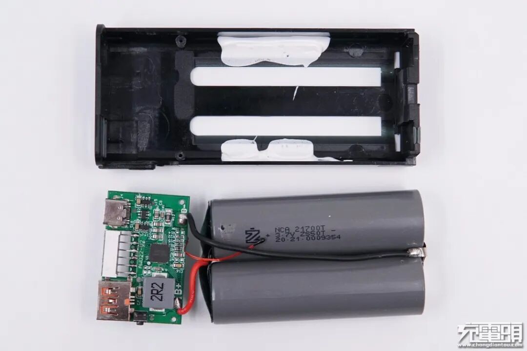 充电头网通过拆解发现,移动电源内置两节21700电芯,移动电源电路板外围简洁,采用一颗智融SW6208主控芯片进行升降压转换,即可实现A+C+L口任意口快充;电芯配有保护电路和热敏电阻,实现过充过放和过热保护,此外还使用硅胶和泡棉进行固定保护;电路板背面露铜加锡和过孔设计,降低大功率充放电的温升。