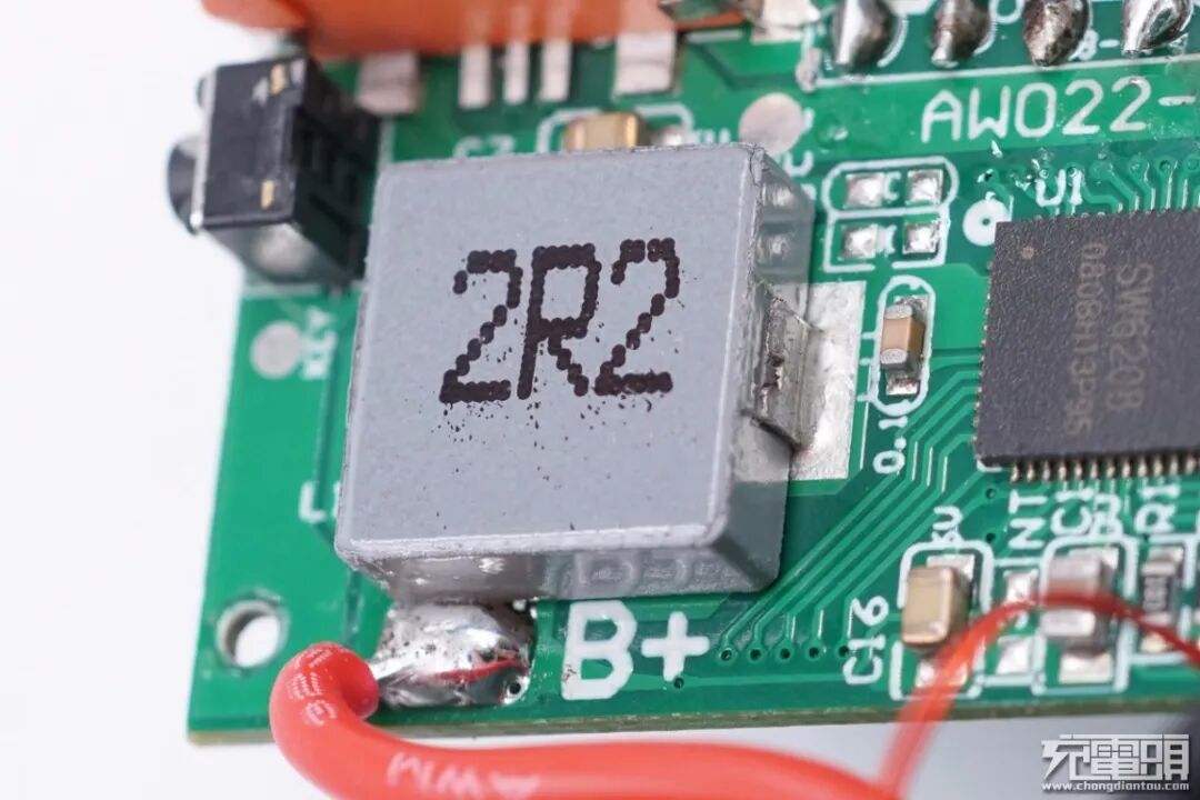 2R2电感特写,10mm大尺寸,内阻更小,发热更低。配合SW6208主控芯片进行升降压。