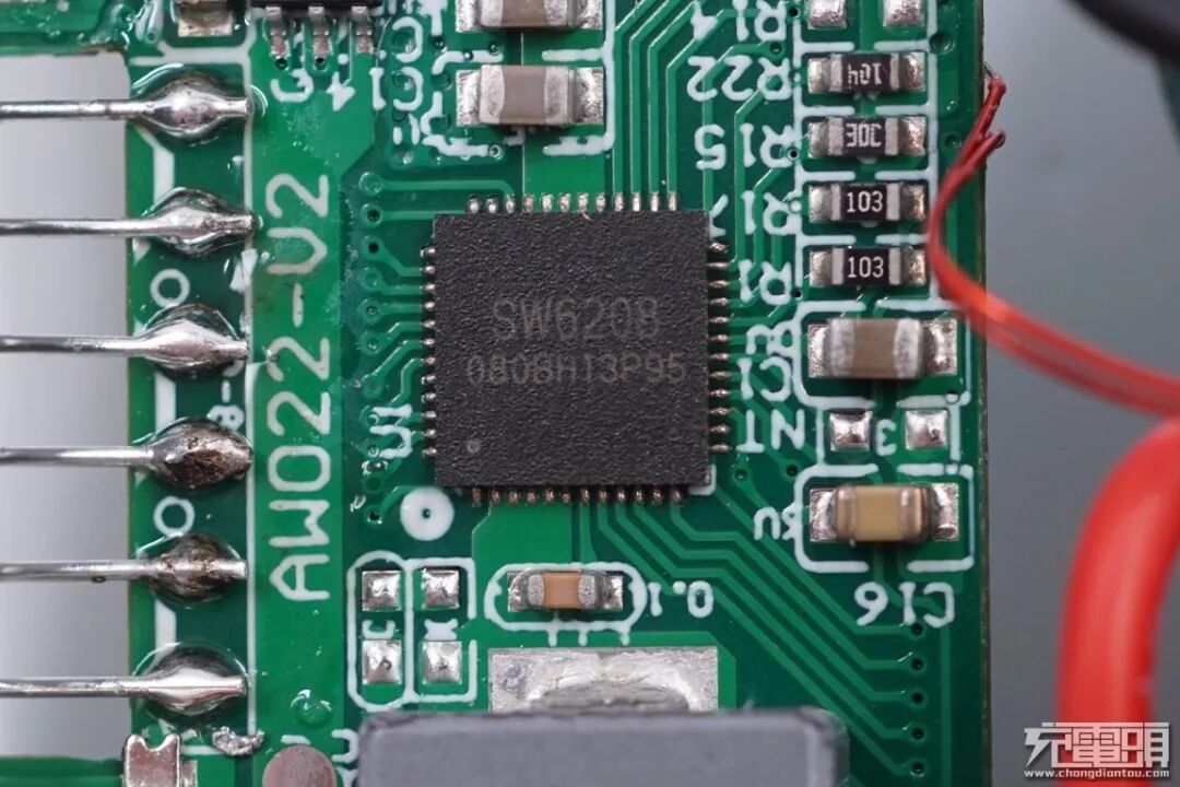移动电源主控芯片采用珠海智融SW6208。这是一款高集成度的多协议双向快充移动电源专用多合一芯片,支持 A+A+B+C+L口任意口快充。其集成了5A高效率开关充电,22.5W高效同步升压输出,支持PPS、PD、QC、AFC、FCP、SCP、PE、SFCP等多种快充协议,电量计量,数码管/LED 灯显示以及相应的控制管理逻辑。外围只需少量的器件,即可组成完整的高性能双向快充移动电源解决方案。