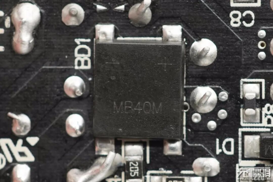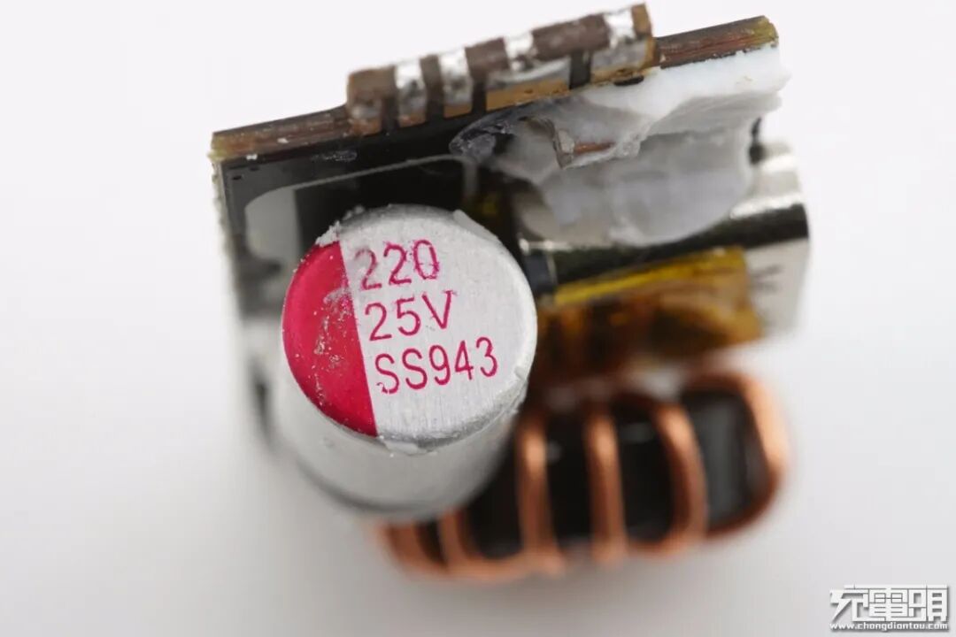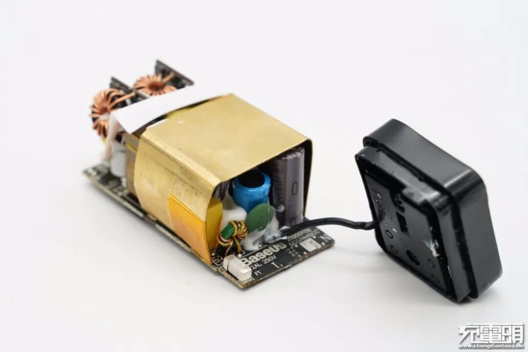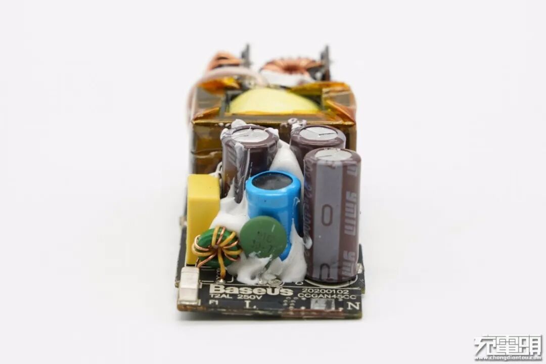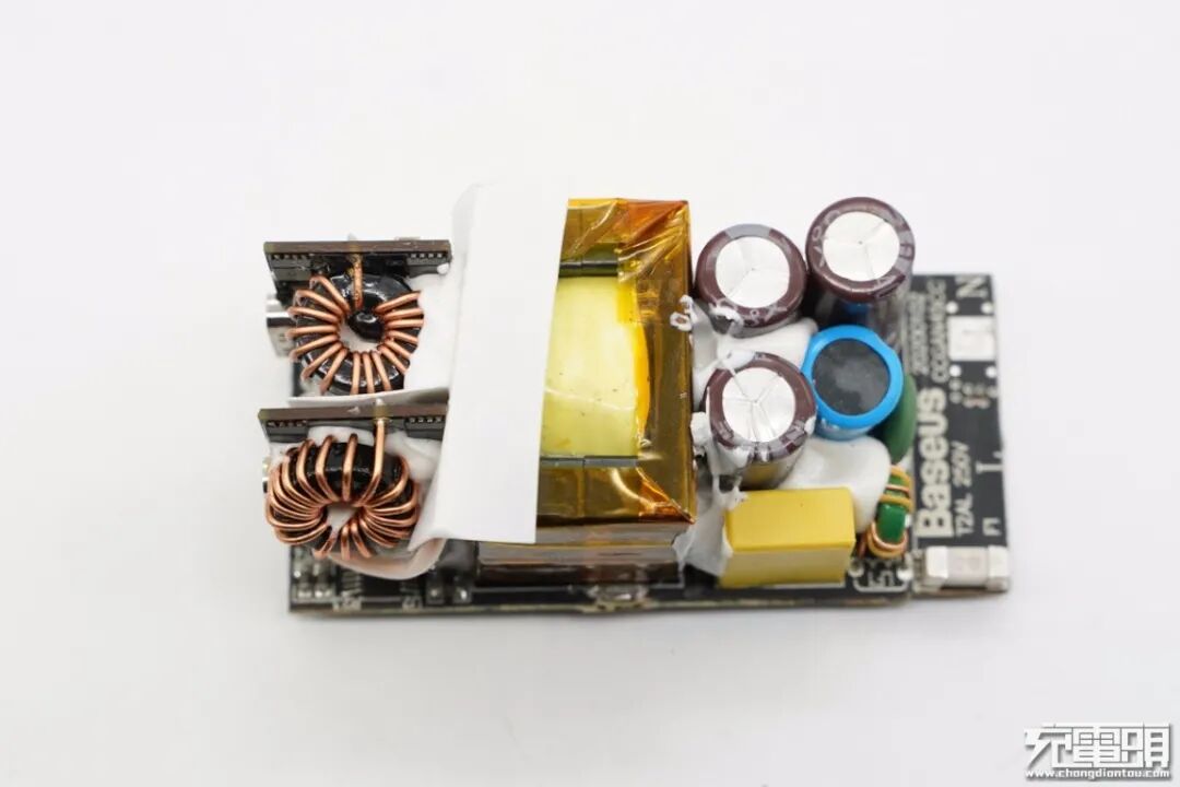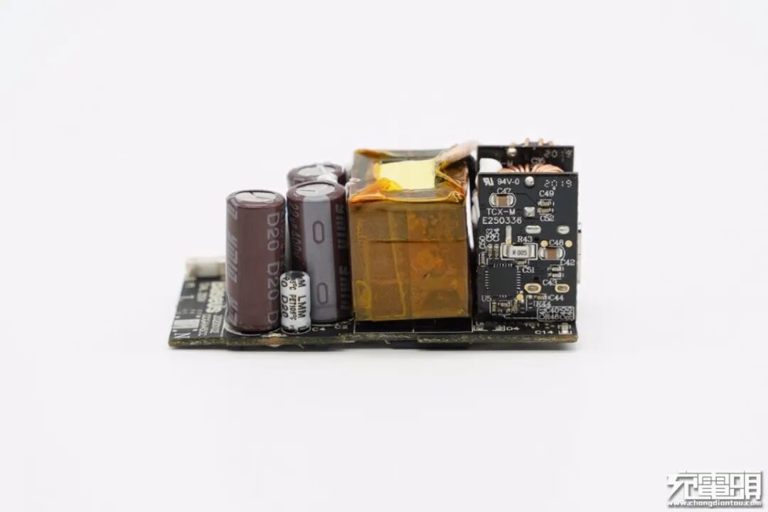 电路板三段式设计,初次级层次分明,PI高集成主控芯片和永铭电容的使用有效减小充电器体积;输入端配有散热片,变压器使用绝缘胶带包裹,内部元器件全部打胶处理,使得充电器稳定性以及散热性能有保证。