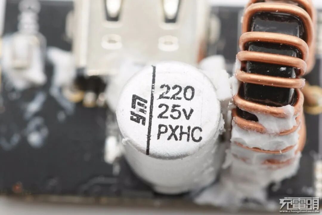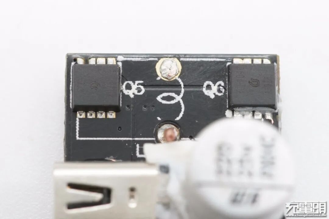 输出端一览,两个USB母座均采用小板垂直焊接。经观察发现,两块小板上的元器件设计一样,均是一颗降压协议芯片搭配两颗同步整流输出MOS,以及降压电感和输出滤波固态电容。