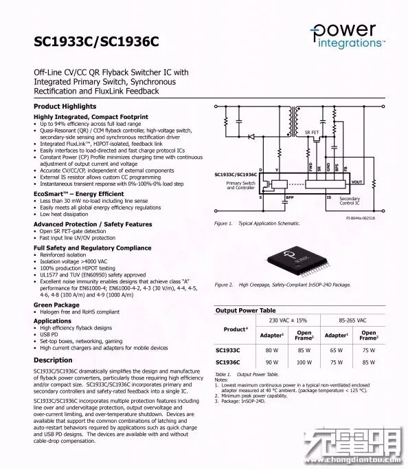 PI SC1933C无需外围元件即可提供精确的恒压/恒流/恒功率,并轻松与外接快充协议接口IC协同工作,因此适用于高效率反激式设计,内置同步整流控制器和反馈,更加节省外部元件。
