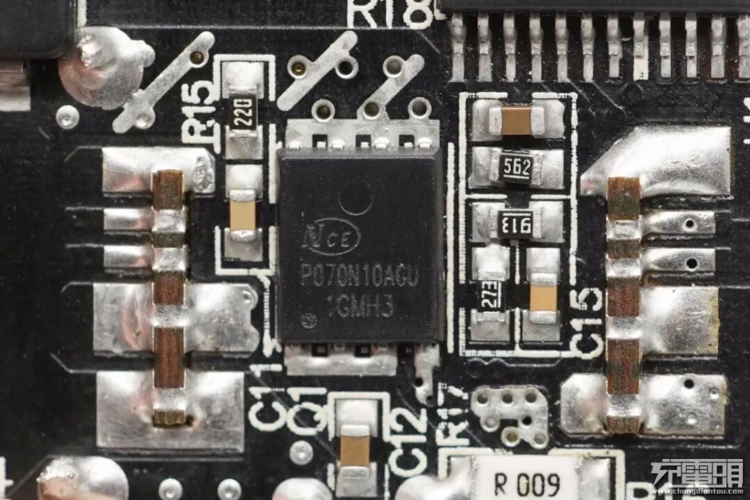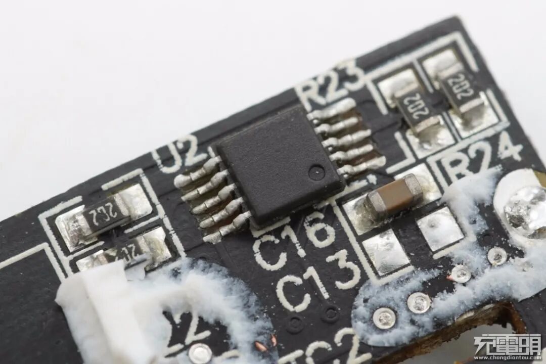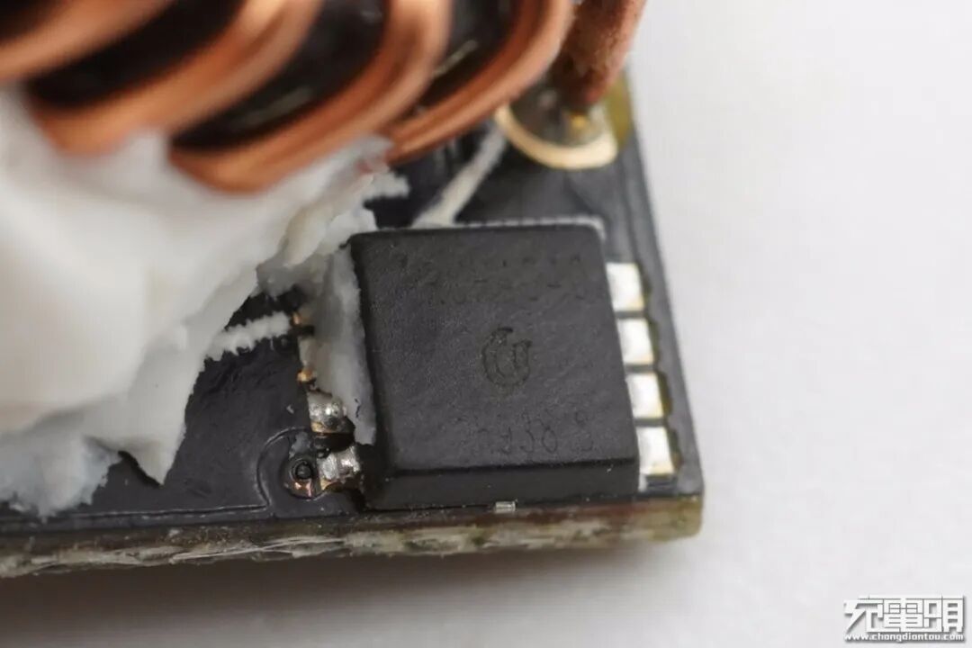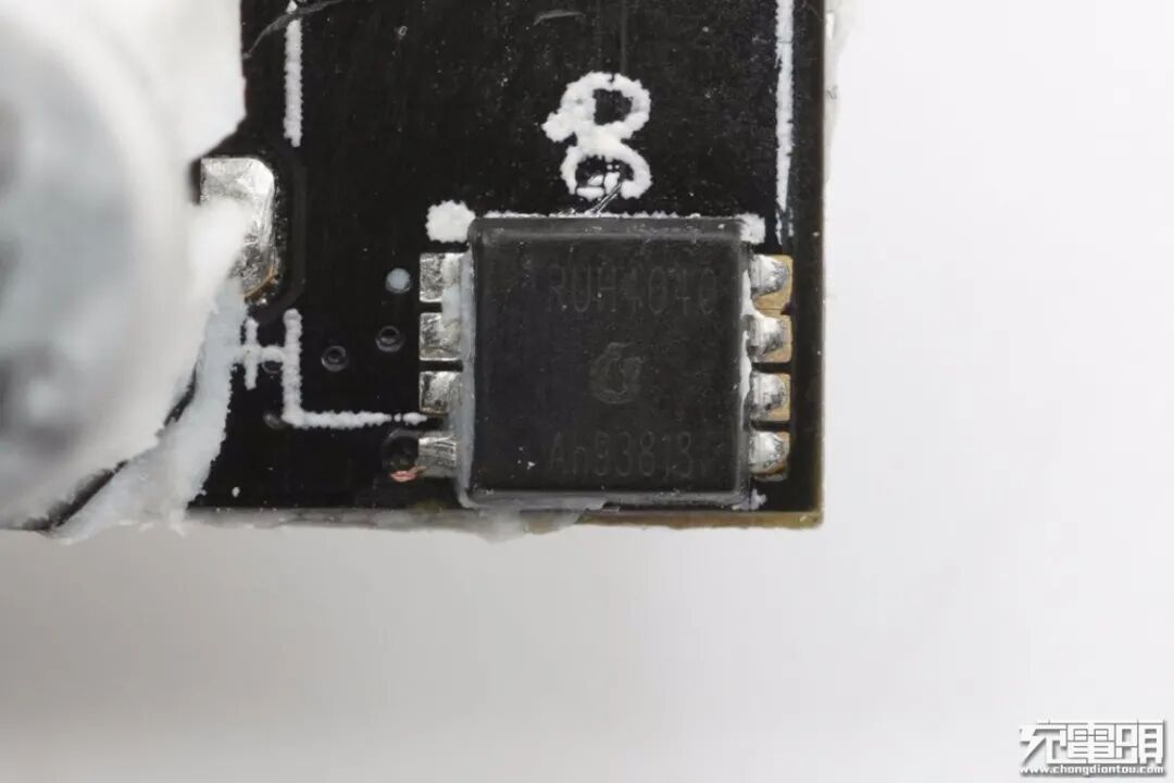 旁边是一颗无丝印MCU,用于双口输出功率智能调节,实现30+18W双口快充模式。
