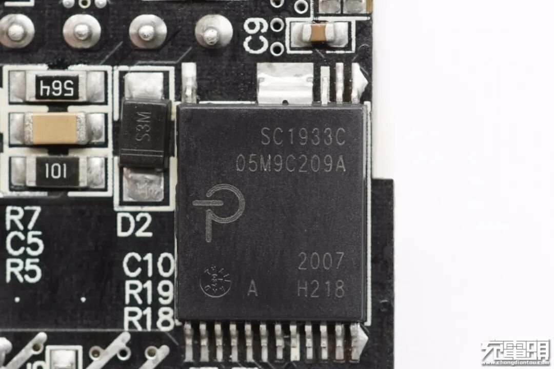 充电头网通过拆解了解到,这款充电器整体电路采用开关电源和两路DC-DC架构,其中开关电源部分,由PI高集成主控芯片SC1933C搭配新功率同步整流MOS,输出固定电压;然后两路均采用智融SW3510搭配锐骏MOS实现二次降压输出。两颗智融SW3510搭配一颗MCU即可实现双口盲插最大都是45W,双口30W+18W输出功率模式。