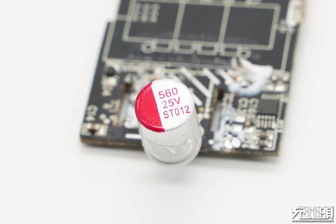 将两块小板拆掉,夹在两块小板之间的是一颗次级同步整流输出滤波固态电容,规格为25V 560μF。