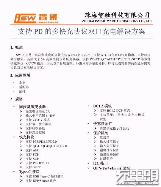 此外其集成了5A高效率同步降压变换器,支持 PPS、PD、QC、AFC、FCP、SCP、PE、SFCP等多种快充协议,CC/CV 模式,以及双口管理逻辑。外围只需少量的器件,即可组成完整的高性能多快充协议双口充电解决方案。