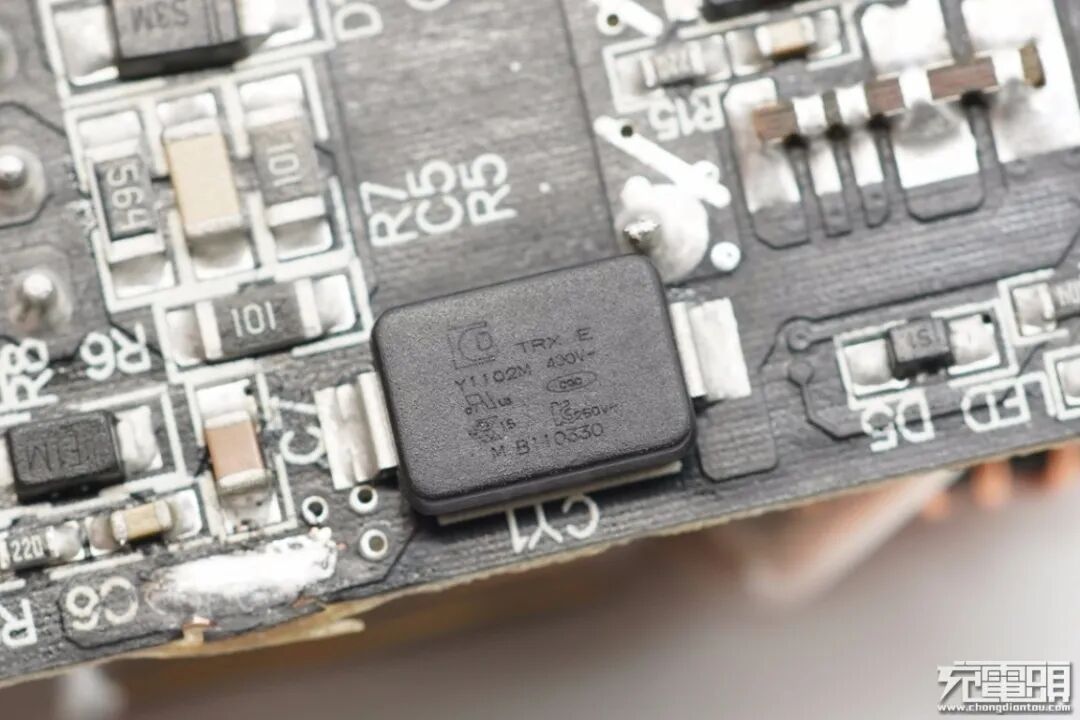 PCB板背面一览,PI GaN主控芯片和Y电容横跨在初次级之间,初次级区间分明。