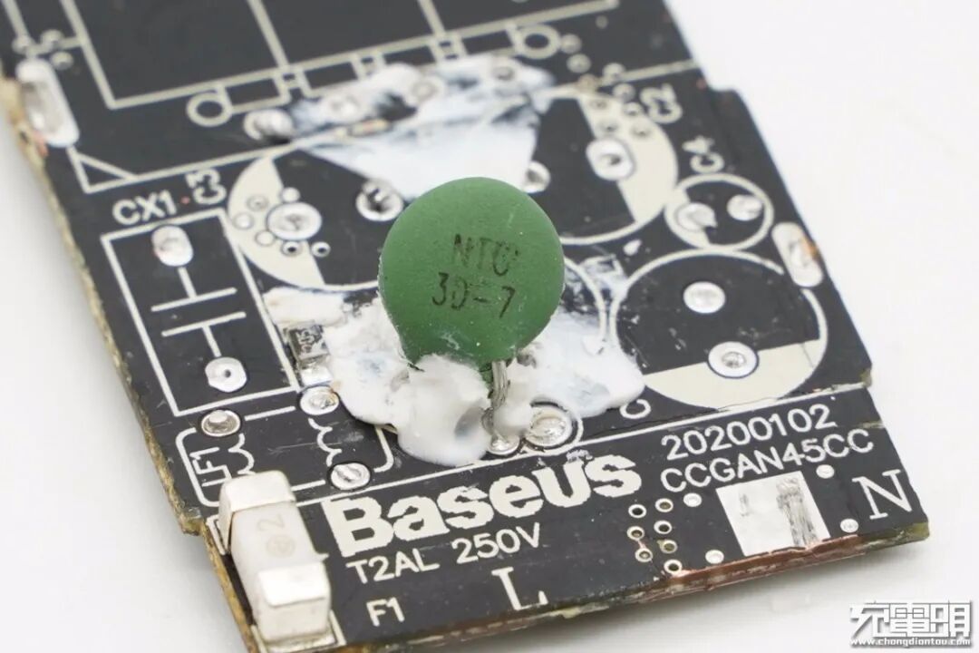 经过对充电器正背面电路分析发现,倍思45W 双C口氮化镓充电器内部采用时下热门的开关电源定压输出,双路独立二次降压输出的设计架构。下面我们就从输入端开始一一了解各元器件的信息。