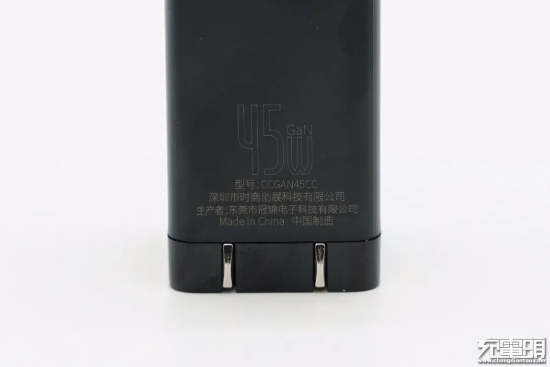 另一侧面上印有45W功率、CCGAN45CC型号、品牌方:深圳市时商创展科技有限公司,生产者:东莞市冠锦电子科技有限公司。
