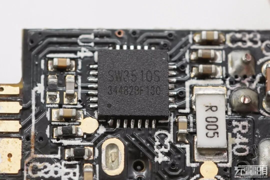 USB-C1小板背面是一颗智融SW3510,用于C1口同步整流降压和协议识别。智融SW3510是一颗内置有USB-C口识别及多种快充功能的高集成度双口充电芯片,支持A+C口任意口快充输出,支持双口独立限流。