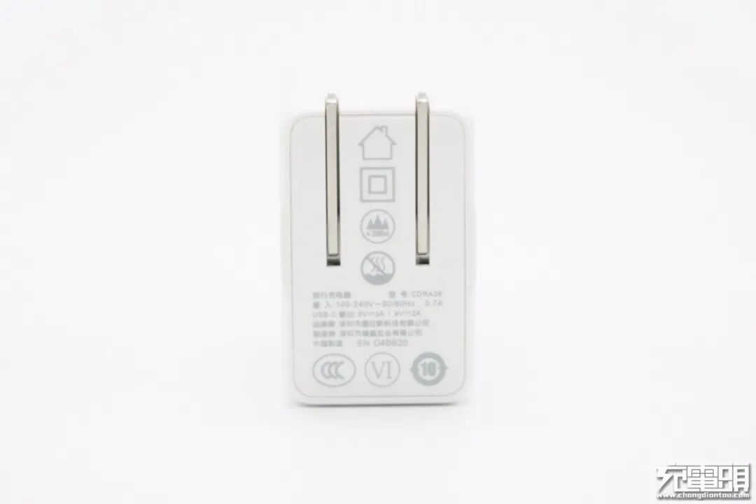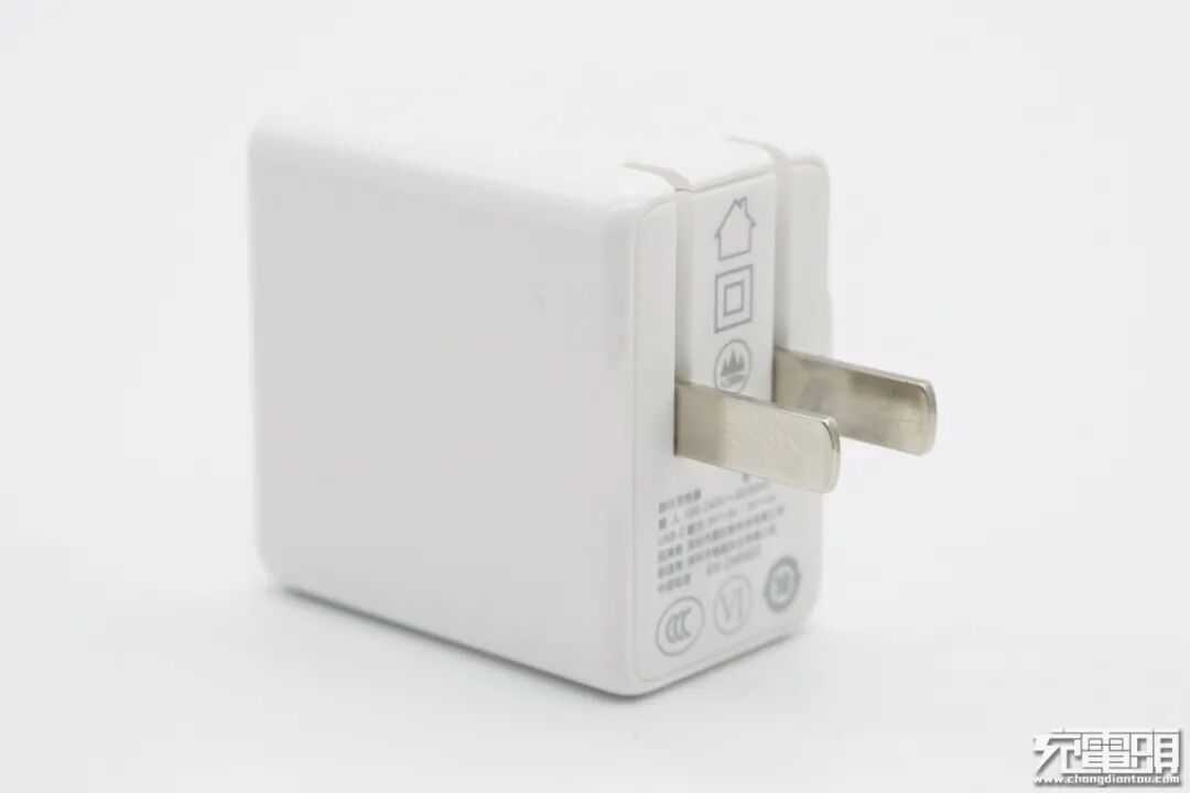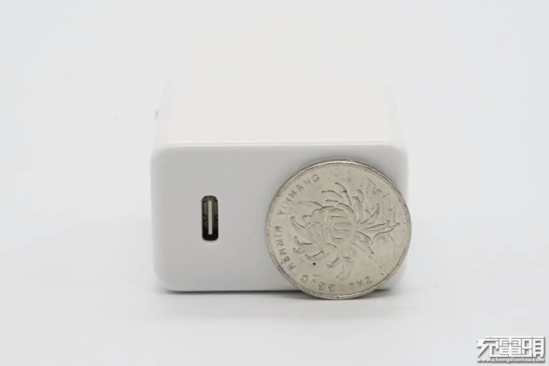 输出端配备一个USB-C接口,白色胶芯不露铜;充电器机身厚度比一元硬币直径大一点。