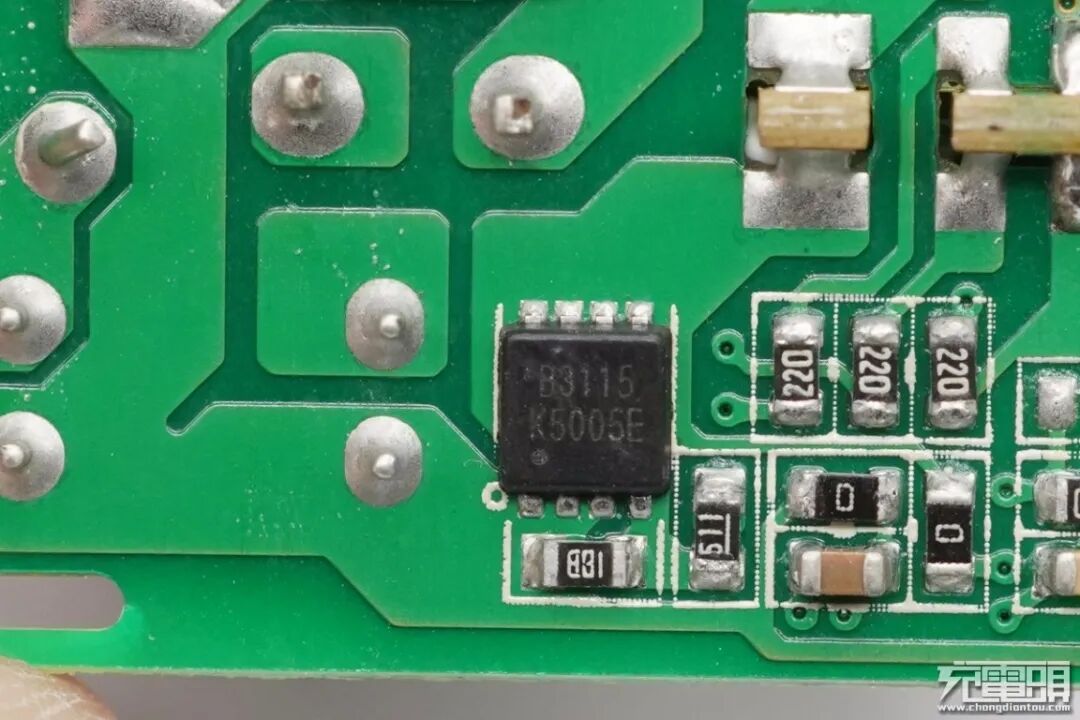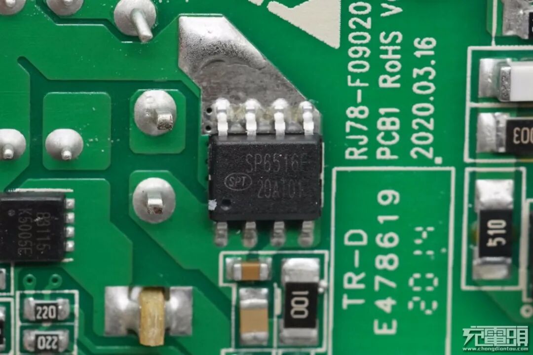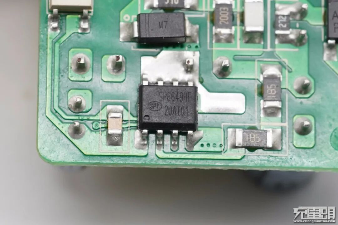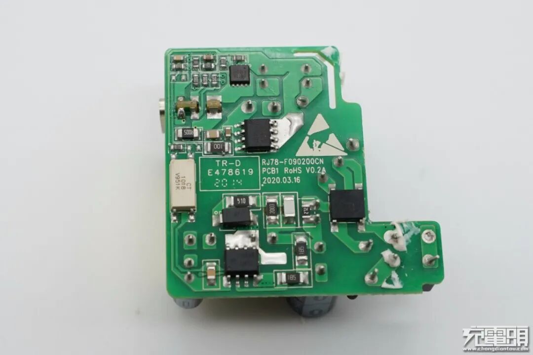 协议芯片部分采用慧能泰HUSB339控制输出所需电压,已通过USB-IF协议认证,兼容性能有保证。此外PCB板上变压器及其周围的元器件打胶处理,增强内部稳定性。