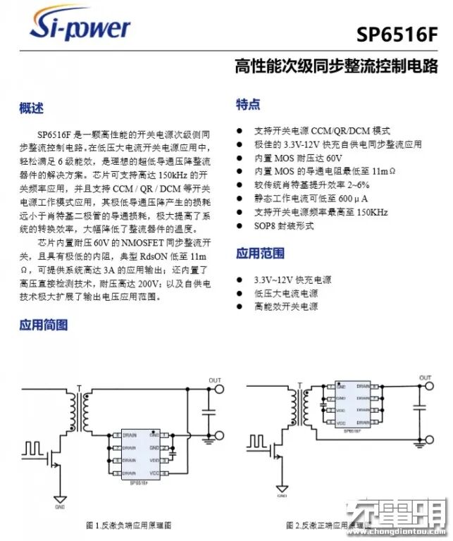 输出同步整流采用硅动力SP6516F次级同步整流芯片,内置耐压60V的NMOSFET同步整流开关,且具有极低的内阻,典型RdsON低至11mΩ,可提供系统高达3A的应用输出,工作电压范围宽,支持多种工作模式,应用方便。