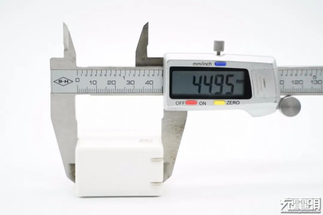 使用游标卡尺实测充电器长44.95mm。