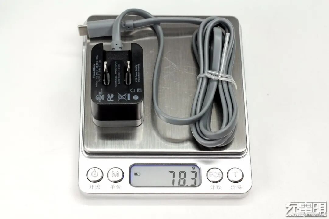 充电器机身外壳由黑灰两部分组成,表面磨砂处理,侧身各面之间弧面过渡;自带USB-C输出线缆,线身扁平设计,两端做了抗弯折处理。