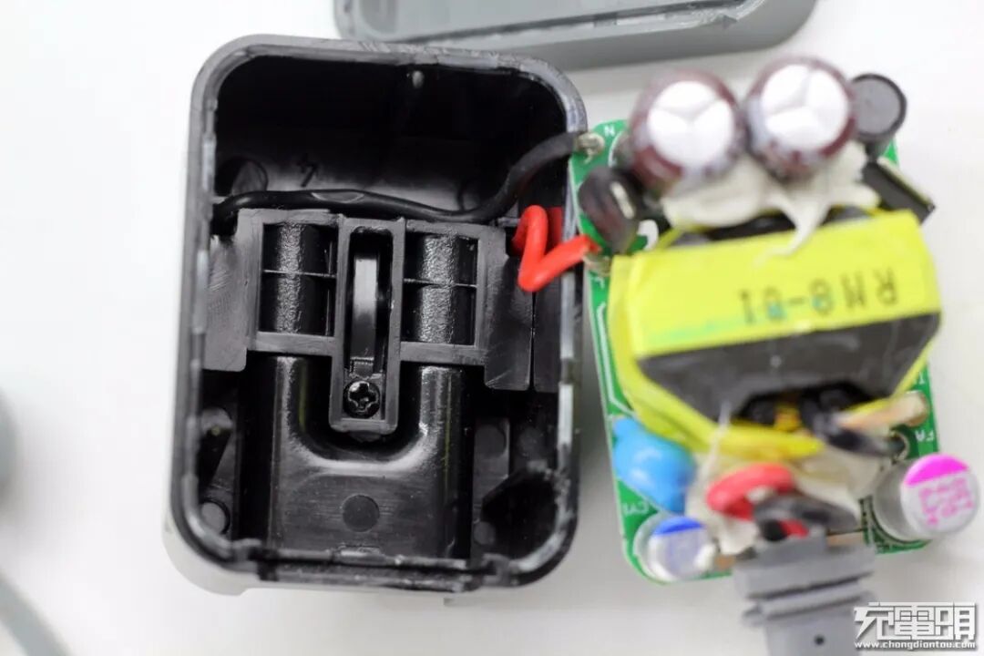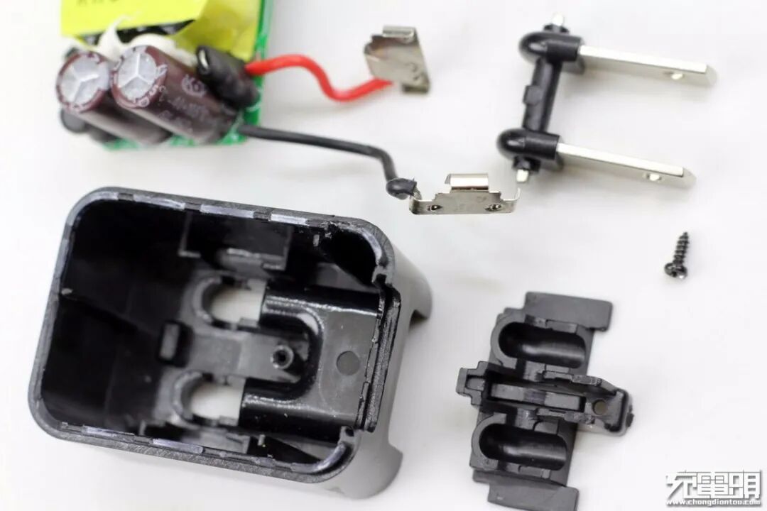 黑灰机身外壳采用超声波工艺焊接,插脚使用螺丝和塑料板固定封装,并通过AC导线和PCB板连接通电。
