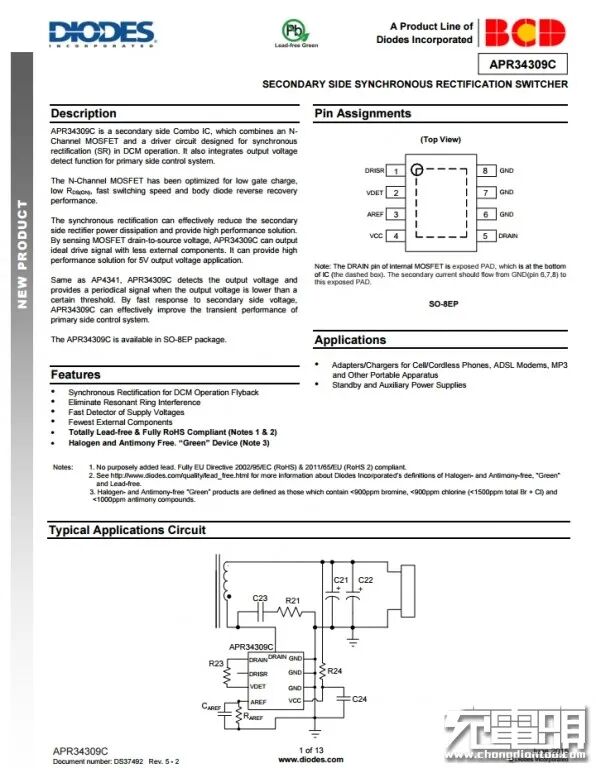 次级同步整流芯片,DIODES APR34309C,内置同步整流管和同步整流控制器。
