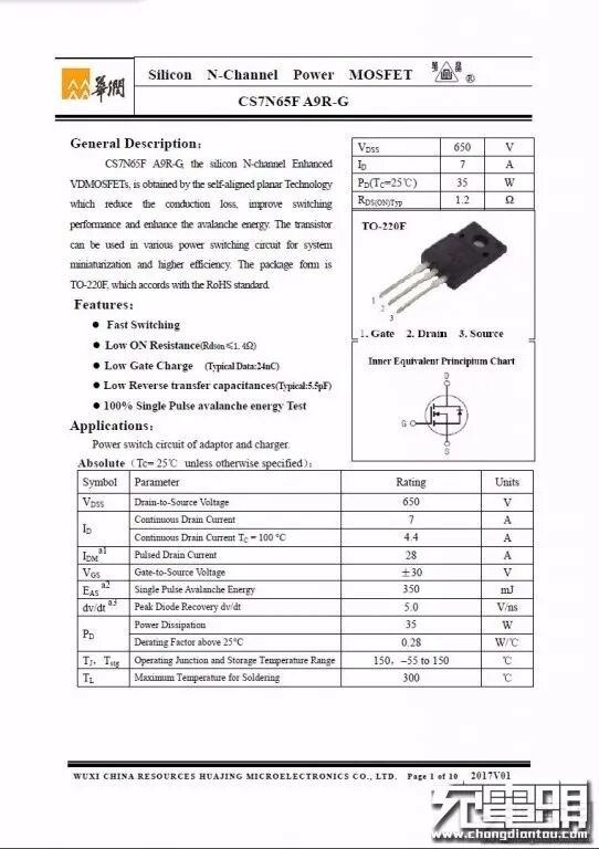 初级开关MOS特写,型号CS7N65F,NMOS,耐压650V,电流7A,导阻1.2Ω,来自无锡华润华晶微电子有限公司。