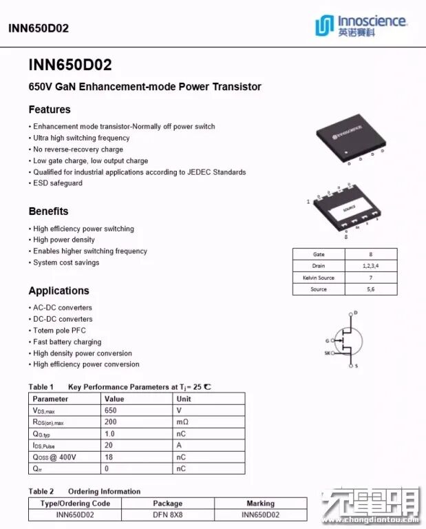 初级侧氮化镓开关管来自英诺赛科,型号是INN650D02 ,耐压650V,导阻低至0.2Ω,符合JEDEC标准的工业应用要求,这是整个产品的核心元器件。INN650D02 “InnoGaN”开关管高频特性好,且导通电阻小,适合高频高效的开关电源应用,采用DFN8*8封装,具备超低热阻,散热性能好,适合高功率密度的开关电源应用。