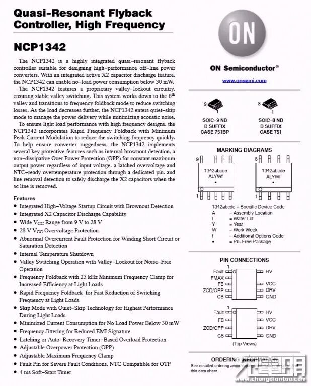 主控芯片为ON安森美NCP1342,这是一颗高频初级PWM控制器,内置主动X2电容放电和多重完善的保护功能。