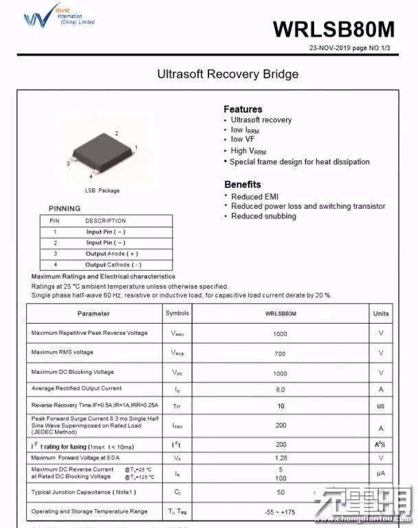 来自深圳市沃尔德实业有限公司的输入端整流桥WRLSB80M,这颗软桥通过较软的恢复曲线,比较平滑的关断特性,可以降低二极管结电容达到非常少的谐波振荡产生的效果。选用的LSB封装,拥有良好的散热特性,帮助中大瓦数适配器提升可靠性,单颗可做60W+。