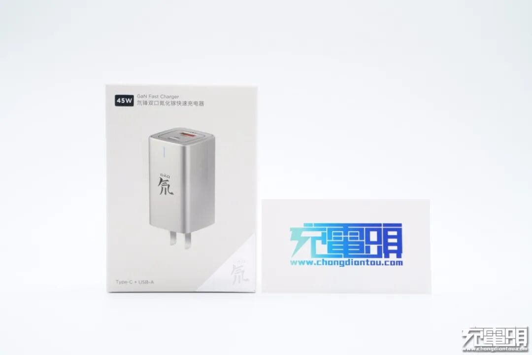 包装盒正面印有产品外观图,上端是45W功率和产品名称,下端是Type-C+USB-A和氘字。整体设计简洁,特点凸出。