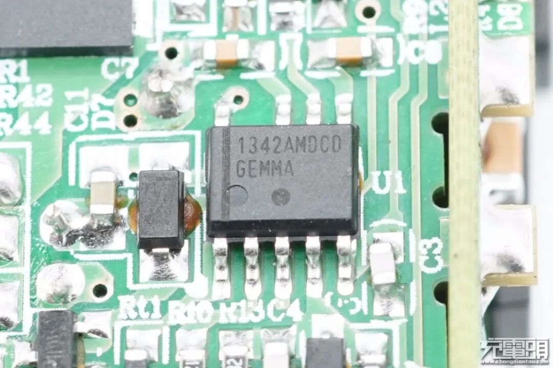 PCB板侧面一览,侧面小板背面设有PWM主控芯片和氮化镓开关管。