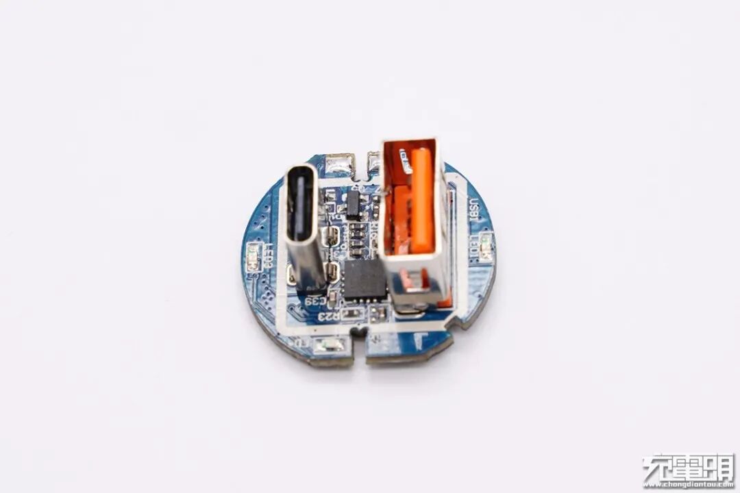 撕掉塑料膜,顶面外壳亮面设计,配备了1A1C两个接口,边缘设有导光圈。