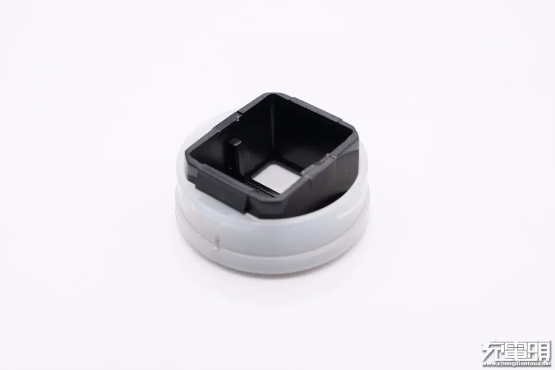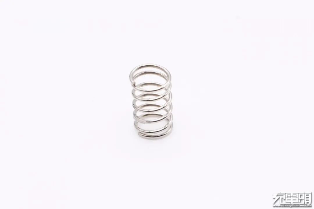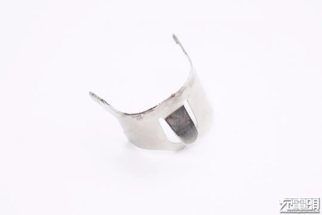 正极顶针特写,与铝合金负极外壳之间有塑料圈绝缘。