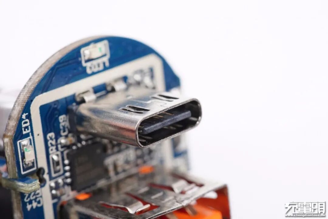 输出小板正面一览,两个母座之间的是USB-C口的PD协议芯片,板子边缘分布有四颗LED灯。