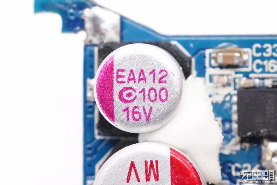 USB-A口的输出滤波固态电容,规格为16V 100μF,来自台系知名品牌APAQ钰邦。