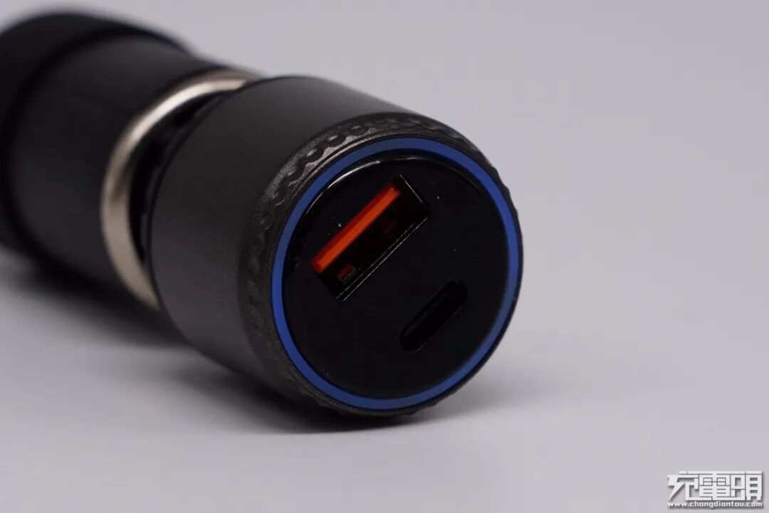 车充通电后导光圈亮蓝光,方便夜间使用,亮度适中不刺眼。