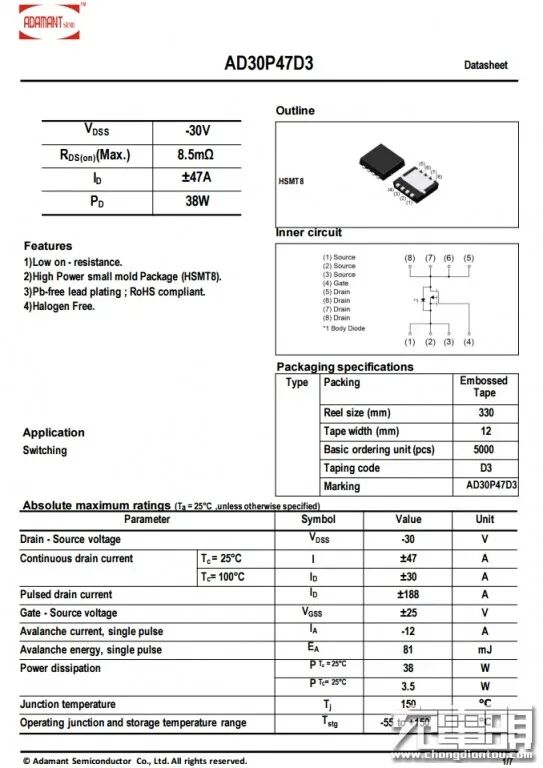 输出VBUS开关采用砹德曼AD30P47D3,耐压30V,PMOS。