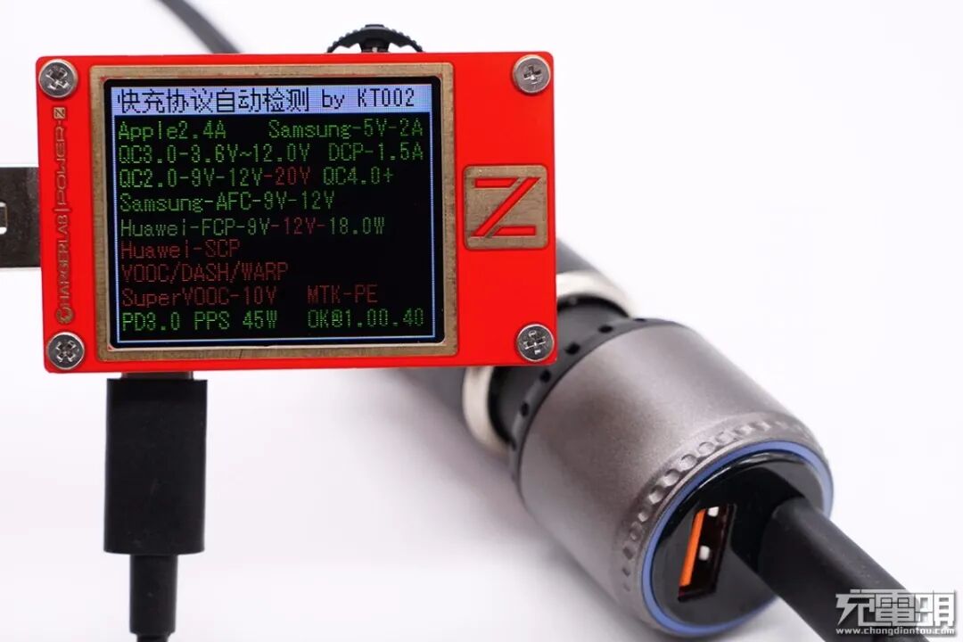 另外使用KT002检测USB-C口输出协议,显示支持Apple 2.4A、Samsung 5V/2A、DCP协议,以及QC2.0/3.0、AFC、FCP快充协议。