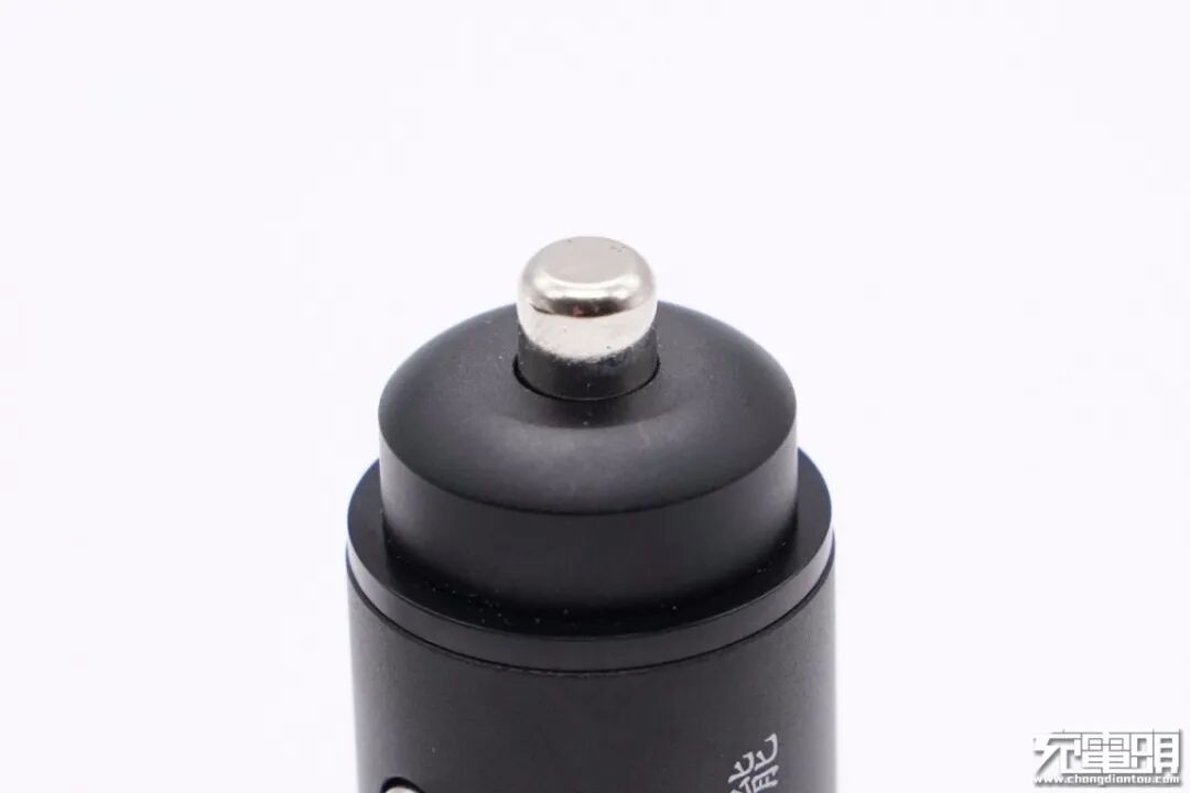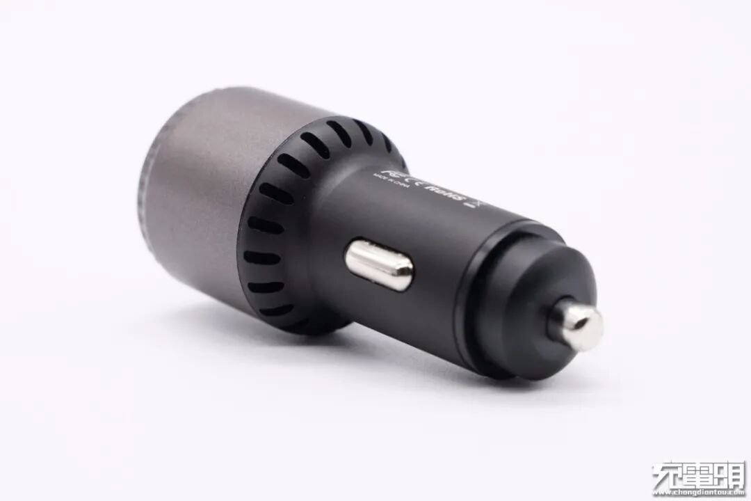 俊凯达智能快充车充黑灰配色,机身壳全部采用铝合金材质,表面喷砂处理,灰黑两段机身之间过渡自然。