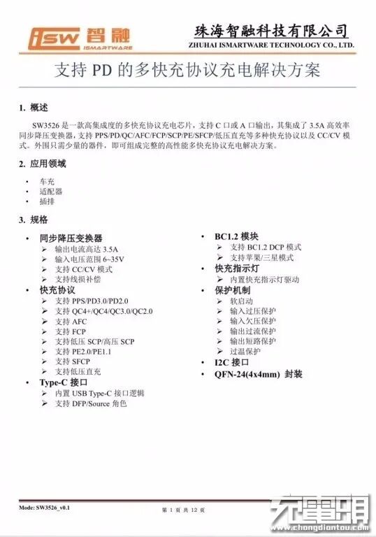 智融SW3526支持USB-C口或者USB-A口输出控制。其集成了3.5A高效率同步降压转换器,支持PPS、PD、QC、AFC、FCP、SCP、PE、SFCP、低压直充等充电协议,支持CC/CV模式,外部仅需少量器件,即可组成完整的高性能多快充协议充电解决方案。