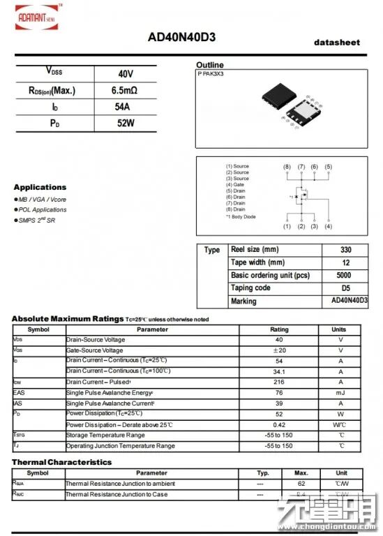砹德曼AD40N40D3,耐压40V,导阻6.5mΩ,四颗组成H桥同步升降压,和电感配合宝砾微PL5500进行升降压。