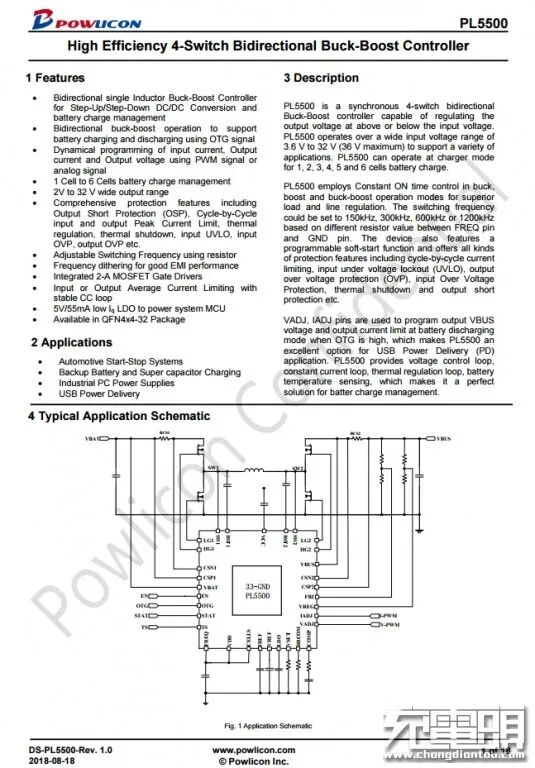 宝砾微同步高效四管双向升降压控制器PL5500。PL5500具有支持正向的充电和反向的放电管理;支持3.5-32V超宽输入电压范围,2-32V的超宽输出电压范围;内部集成5V/55mA LDO;开关频率可调;可编程连续电流模式和轻载高效率模式;输入欠压、输出过压、输出短路、输入输出逐周期峰值电流限制、过温等多种保护功能;效率高达98%以上;高性价比等特点。