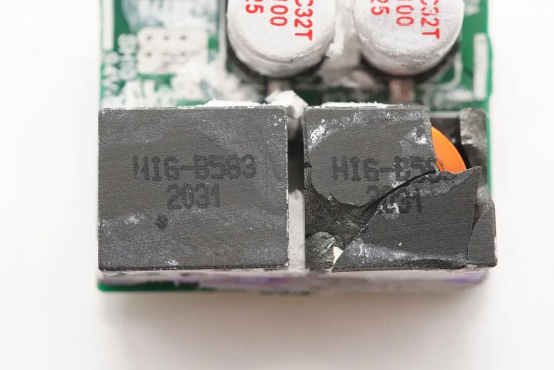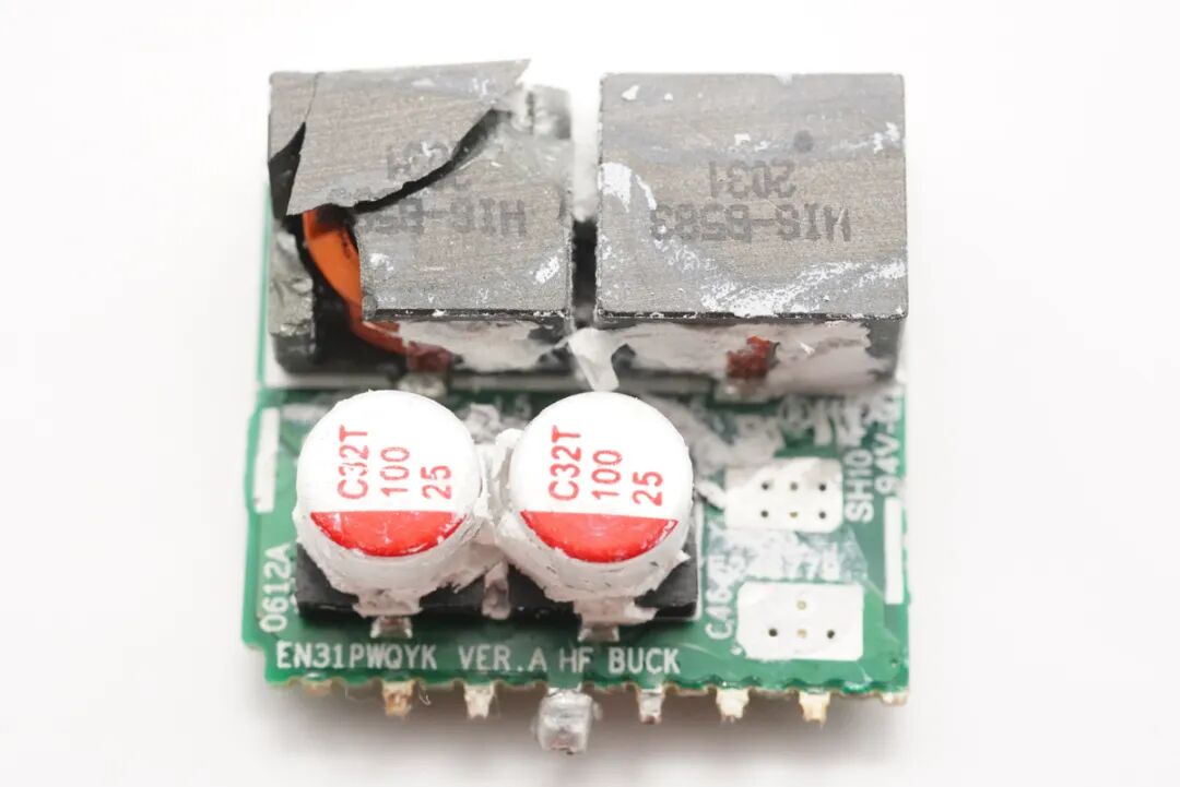 二次降压小板正面一览,降压电感和固态电容成对布置。其中一颗电感因为拆解过程中用力过猛破损。