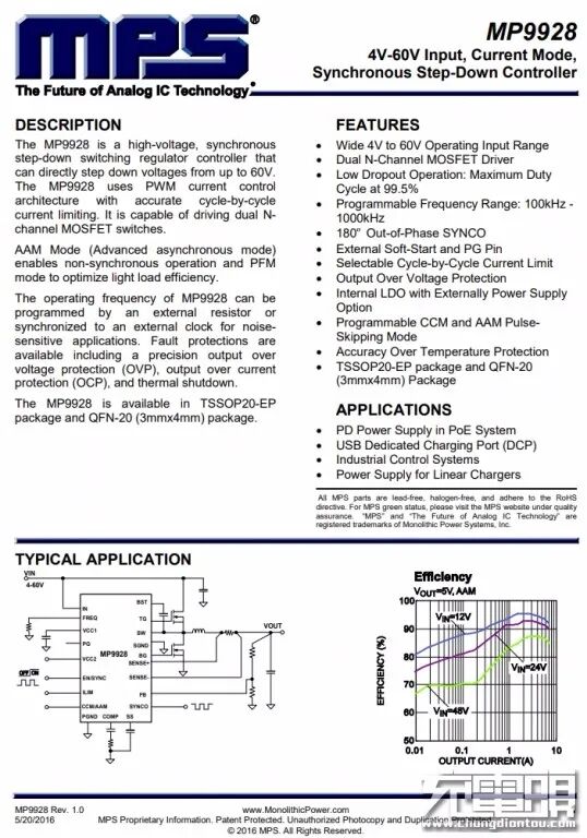 MPS芯源半导体的MP9928同步整流降压控制器,输入电压最高60V,支持多重保护功能,采用QFN3X4mm封装,内置双NMOS驱动器,驱动外置开关管进行输入降压操作。两颗分别用于USB-C和USB-A两路电路二次降压输出。