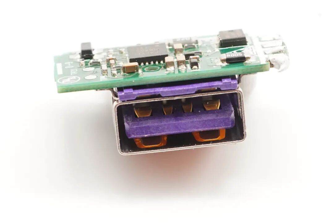 输出端一览,右侧小板上设有两路二次降压电路,分别用于1A1C接口二次降压输出。左侧两个USB母座分别焊接在两块小板上,外围塑料框架加固。