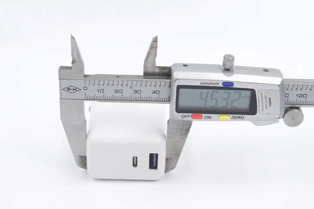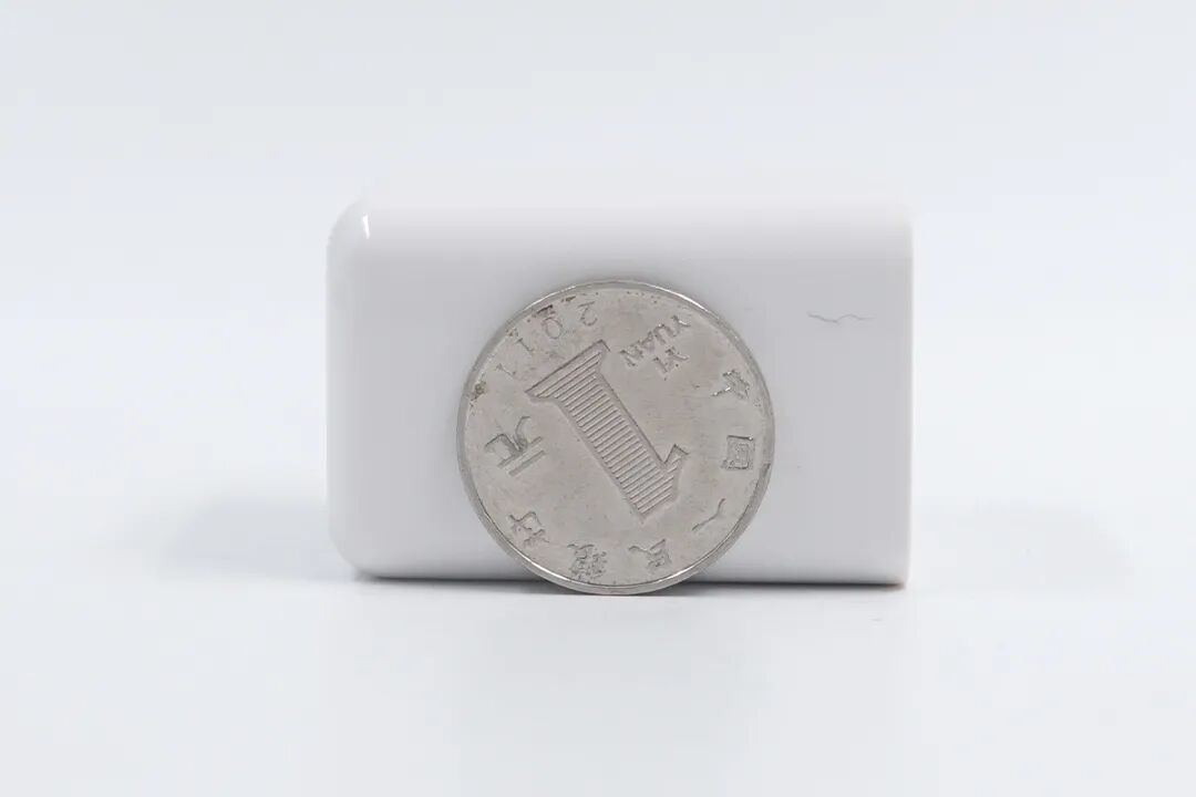 高度为46.34mm。通过充电器三围可算出体积为65.08cm³,功率密度达到1.0W/cm³,这对于65W多口充电器而言,十分难得。