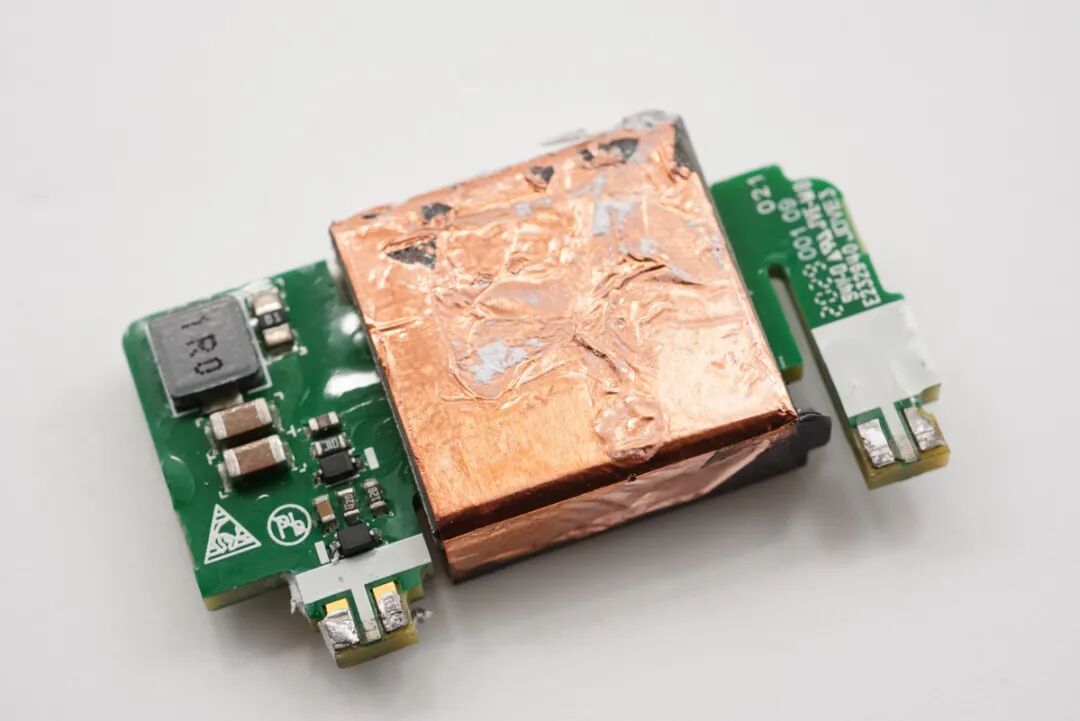 将充电器取出,顶部以及输出端二次降压板上覆盖散热片,散热片上粘贴绝缘胶带进行绝缘和固定,里侧分别贴有导热铜箔和导热垫,输出接口小板上有塑料外壳加固。